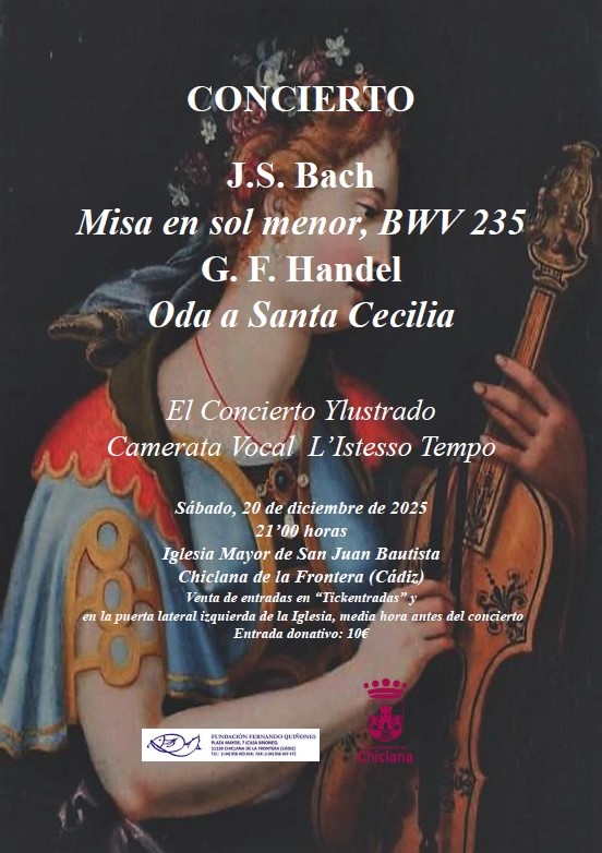 Iglesia Mayor de San Juan Bautista Plaza Mayor, Chiclana de la Frontera, SpainCONCIERTO DE NAVIDAD EL CONCIERTO YLUSTRADO CAMERATA L’ISTESSO TEMPO M. Carmen Patiño, soprano Toñi Martínez, contralto P. Miguel Calvo, tenor Ángel Tomás Pérez, bajo Alfredo Jaime y Carlos Jaime, concertinos José Luís López Aranda, órgano y dirección PROGRAMA - Johann Sebastian Bach: Misa en sol menor, BWV 235 (1730-40) - Georg Friedrich Händel: Oda a […]