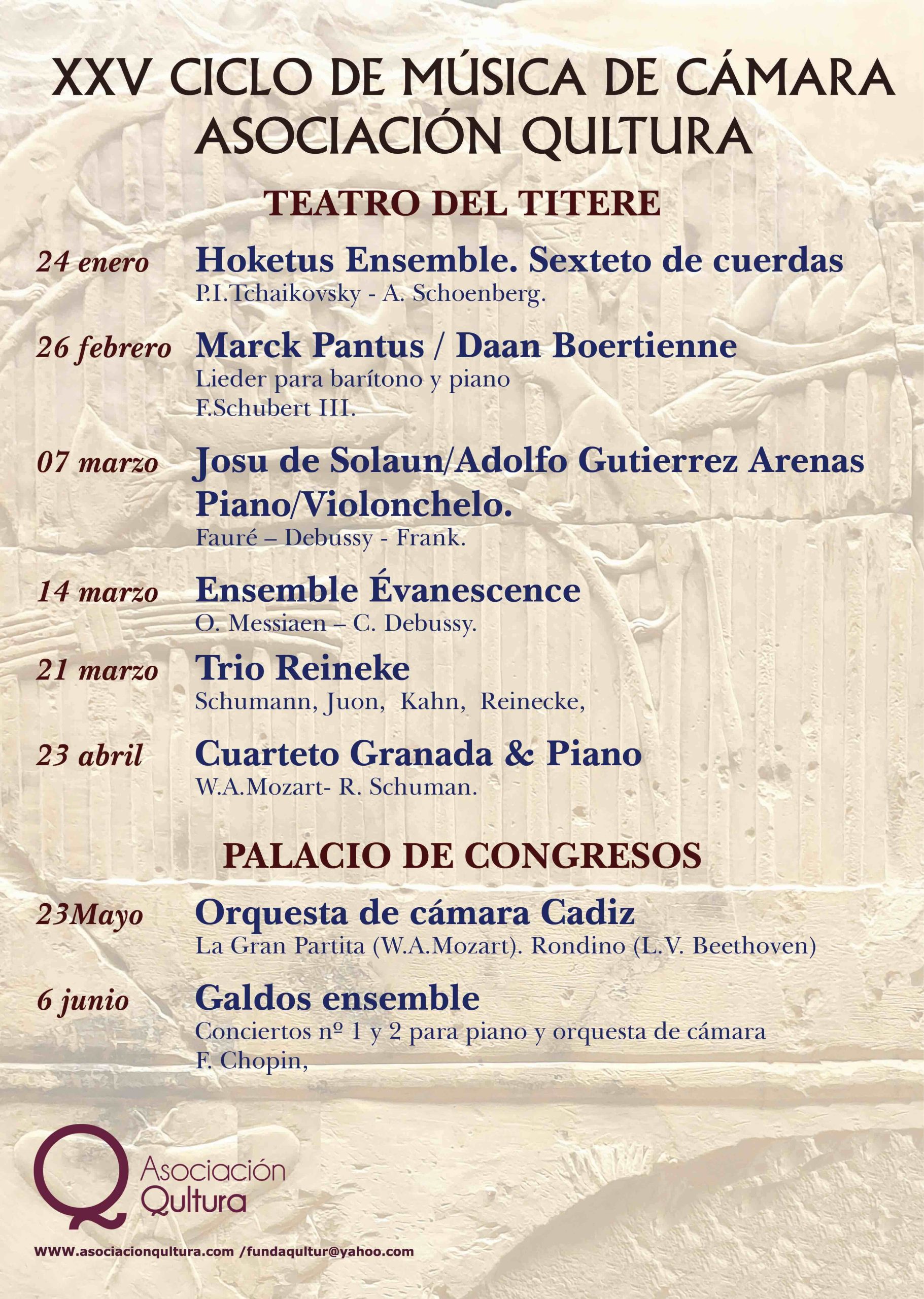 Teatro del Títere "La Tía Norica" Calle De San Miguel 15, Cádiz, Cádiz, SpainXXV CICLO DE MÚSICA DE CÁMARA ASOCIACIÓN QULTURA HOKETUS ENSEMBLE, sexteto de cuerdas Programa: Souvenir de Florencia Obras de P. I. Tchaikovsky y Arnold Schoenberg. Con la colaboración del Ayuntamiento de Cádiz.